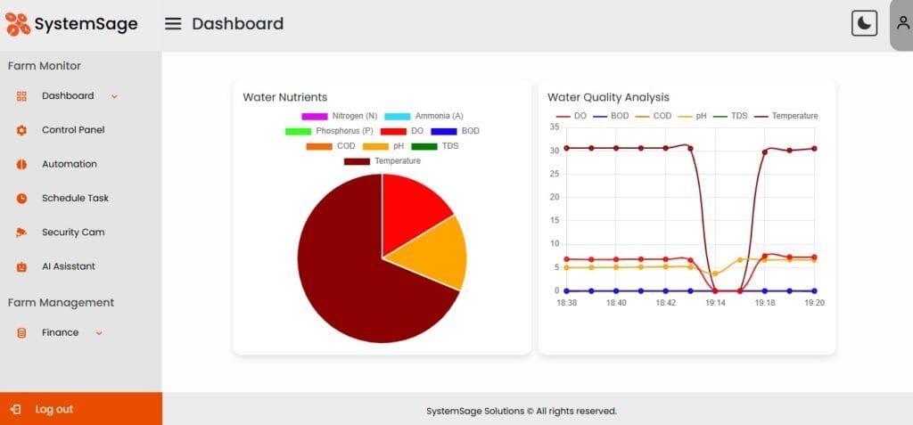 SystemSage FarmGenius PaniSampad (পানিসম্পদ) is a smart water monitoring and control system designed for aquaculture and industrial water management in Bangladesh. It not only provides real-time water quality monitoring but also automatically manages aerators, pumps, and dosing units to maintain optimal water conditions. Using RS485-connected sensors and multiple connectivity options including 4G, Wi-Fi, LoRa, Mesh Network, and Offline mode, PaniSampad ensures healthy water ecosystems, operational efficiency, and sustainable practices.